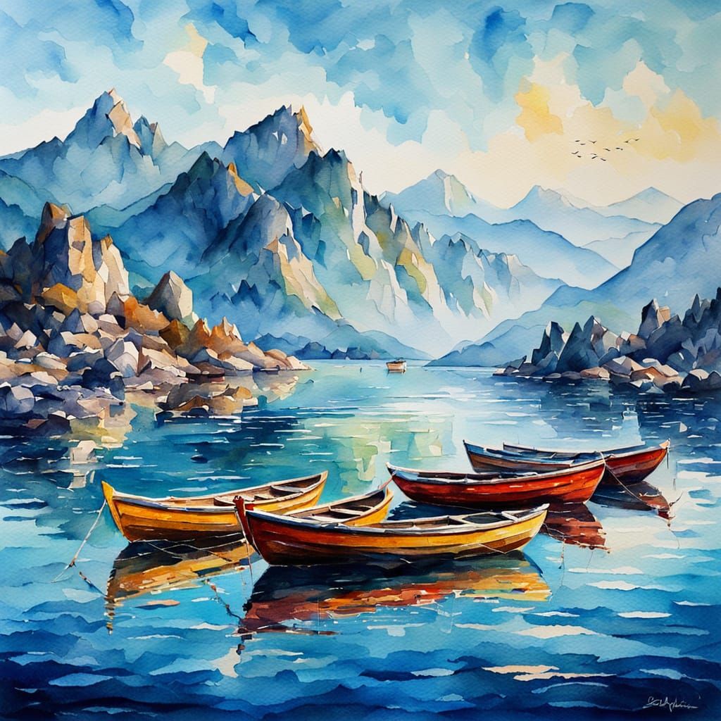 A watercolor painting of small wooden boats floating on calm, blue water. Jagged mountains rise in the distance, with soft brushstrokes and warm sunlight creating a dreamy, vibrant scene.