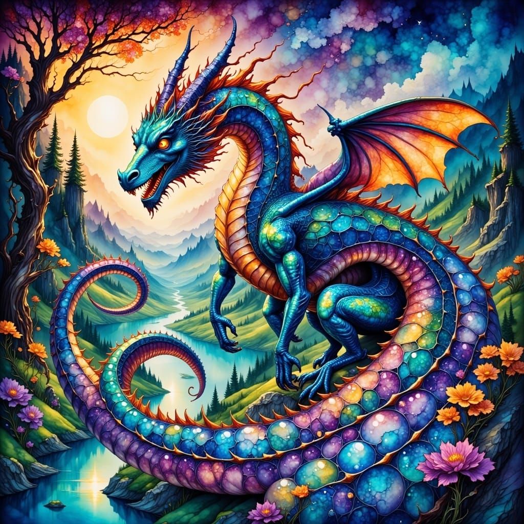 <lora:Fantasy Ink Flux:1.0> A majestic, colossal dragon, rendered in a vibrant alcohol-ink style with intense, saturated, and contrasting colors. The dragon's form is intricately composed of countless iridescent, shimmering bubbles that catch and refract light, creating a breathtaking, ephemeral spectacle. Epic fantasy setting, with ethereal backlighting and glowing highlights accentuating the translucent, multifaceted textures of the bubble-dragon, inspired by the fluid, organic works of Zdzisław Beksiński and Patrick J. Jones.