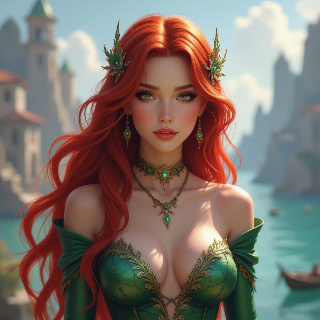 This image shows a lean, petite mermaid warrior with long red hair in a fantasy city. She is depicted as a showgirl in a detailed digital painting with dynamic lighting.