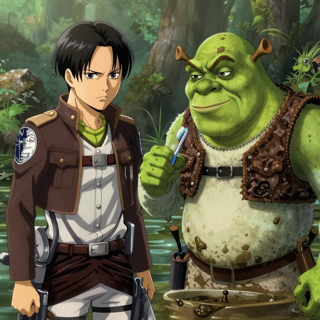 This image depicts Captain Levi from Attack on Titan meeting Shrek in a swamp. The scene is rendered in a highly detailed anime style with dynamic lighting, contrasting the swamp's earthy tones with Levi's uniform.