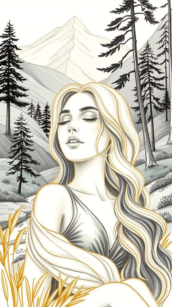 This image shows a peaceful woman surrounded by natural beauty, with expressive golden pencil lines and a focus on gentle textures and curves.
