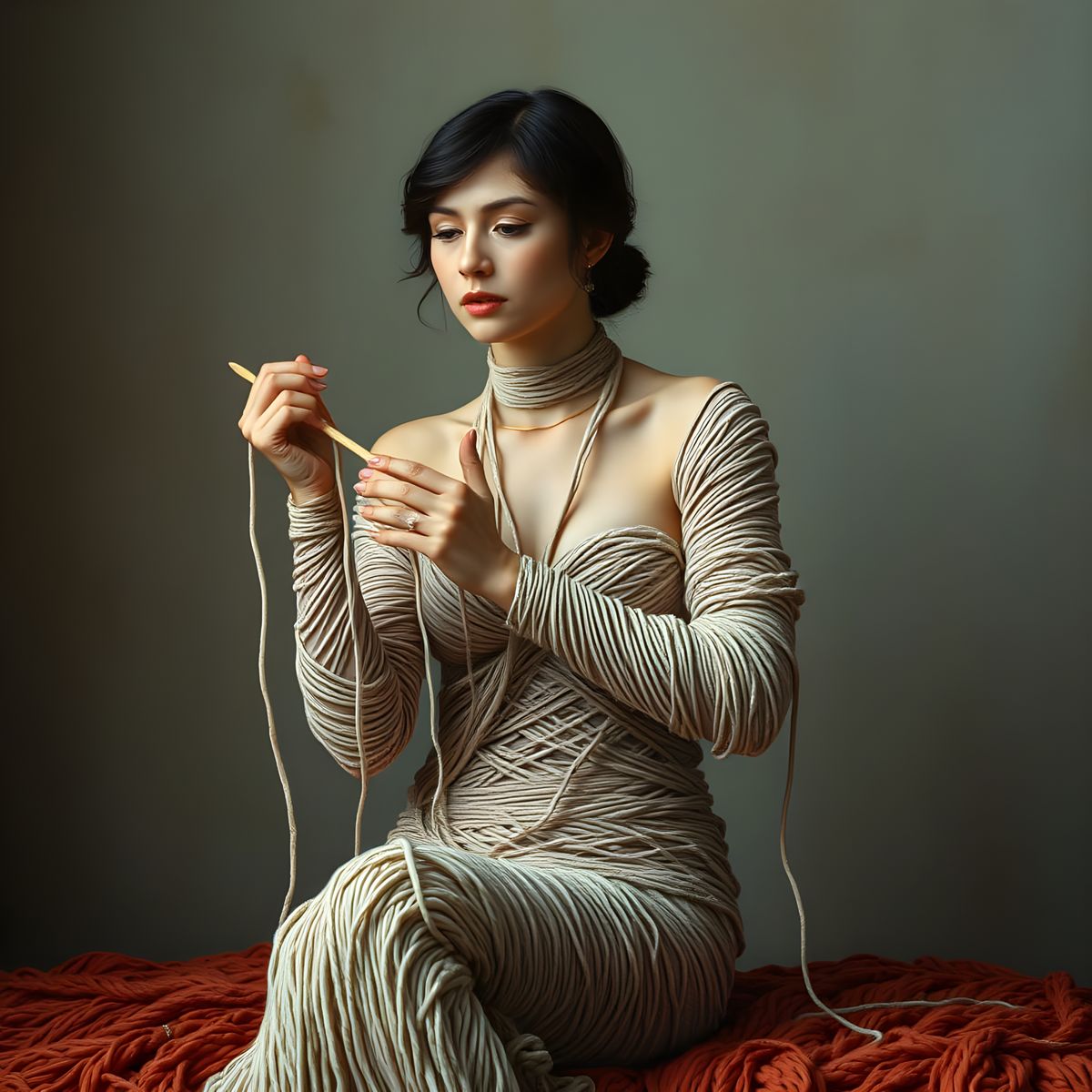 Gentle Entanglement embodies cozy surrealism by transforming an act of care—wrapping, knitting, enclosing—into a quiet paradox. The threads suggest warmth, patience, and self-soothing, yet their excess blurs the boundary between comfort and capture. The figure appears safe, even tenderly held, while simultaneously dissolving into the material that protects her. Cozy surrealism here proposes that comfort is not merely softness, but surrender: a willing intimacy with constraint, where the strange becomes nurturing and the familiar turns dreamlike. The work invites the viewer to rest inside uncertainty, finding calm not despite the surreal, but because of it.