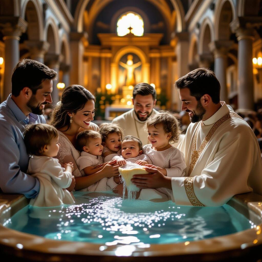 A touching image capturing a baby's baptism ceremony. Parents, godparents and a priest surround the child in a basilica. The scene is bathed in dramatic lighting, reminiscent of film photography.