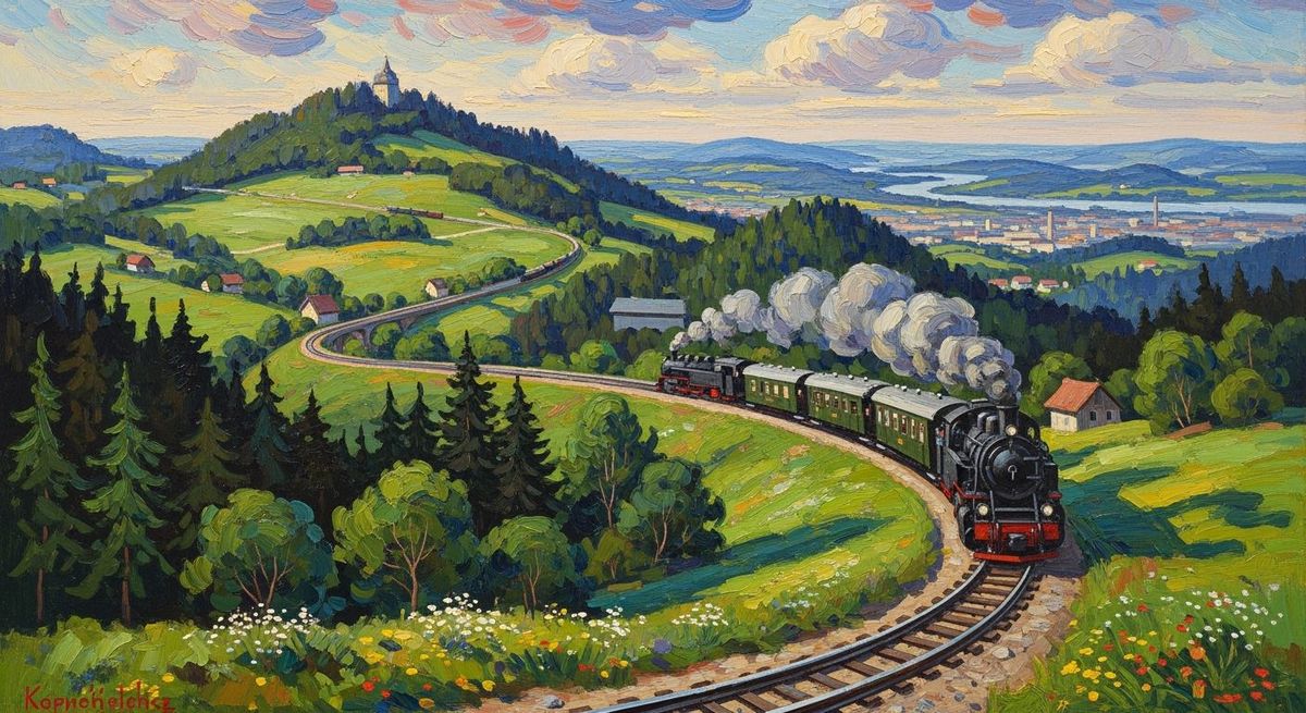 A vibrant oil painting showing a vintage narrow-gauge railway ascending through Austria's lush hills. The landscape is rendered with thick brushstrokes and a rich color palette, as a dynamic blend of impressionistic and romantic styles.