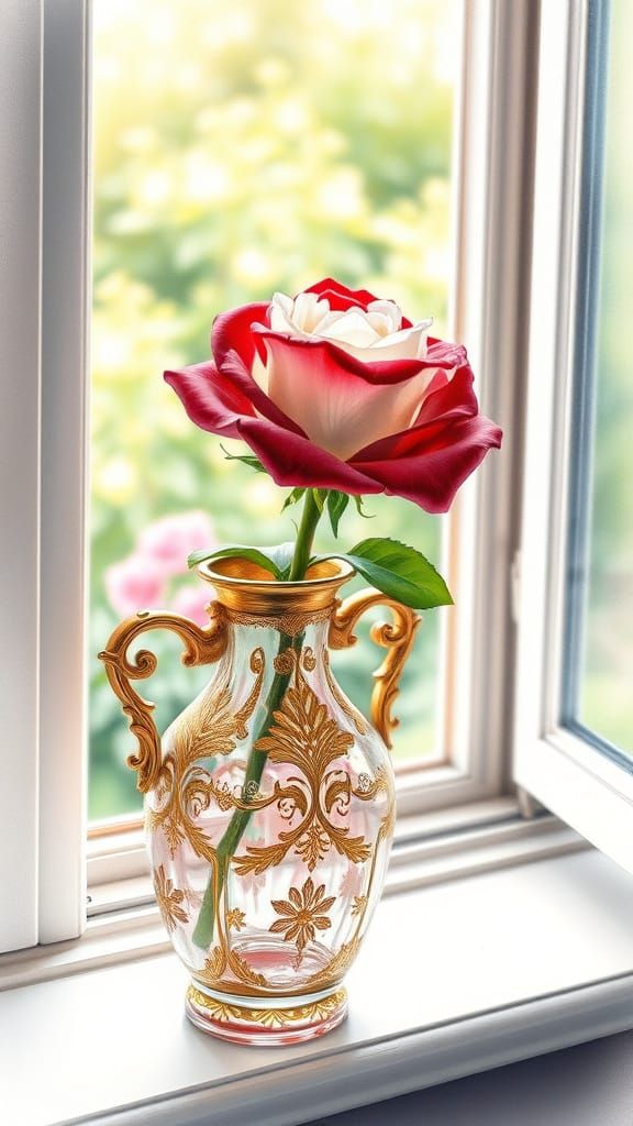 This image showcases a realistic watercolor painting of an ornate, gold-trimmed glass vase holding a red and white rose. The scene features an open window with a garden view, rendered with delicate brushstrokes and soft lighting.