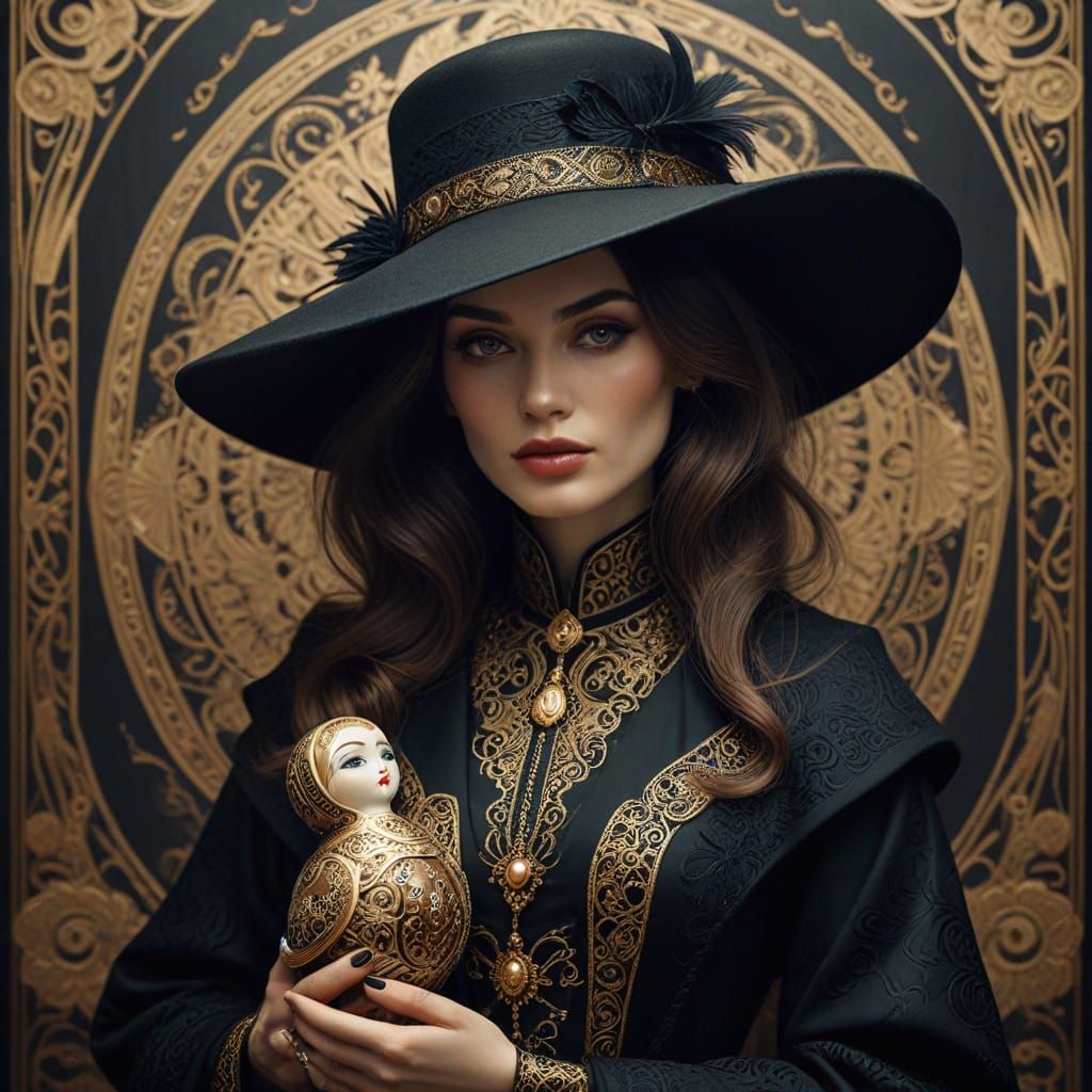 This image showcases a strong female figure, reminiscent of vintage illustration, with intricate art nouveau patterns and luxurious fabrics. A miniature Russian doll is held, exuding a mysterious, mafia-inspired atmosphere.