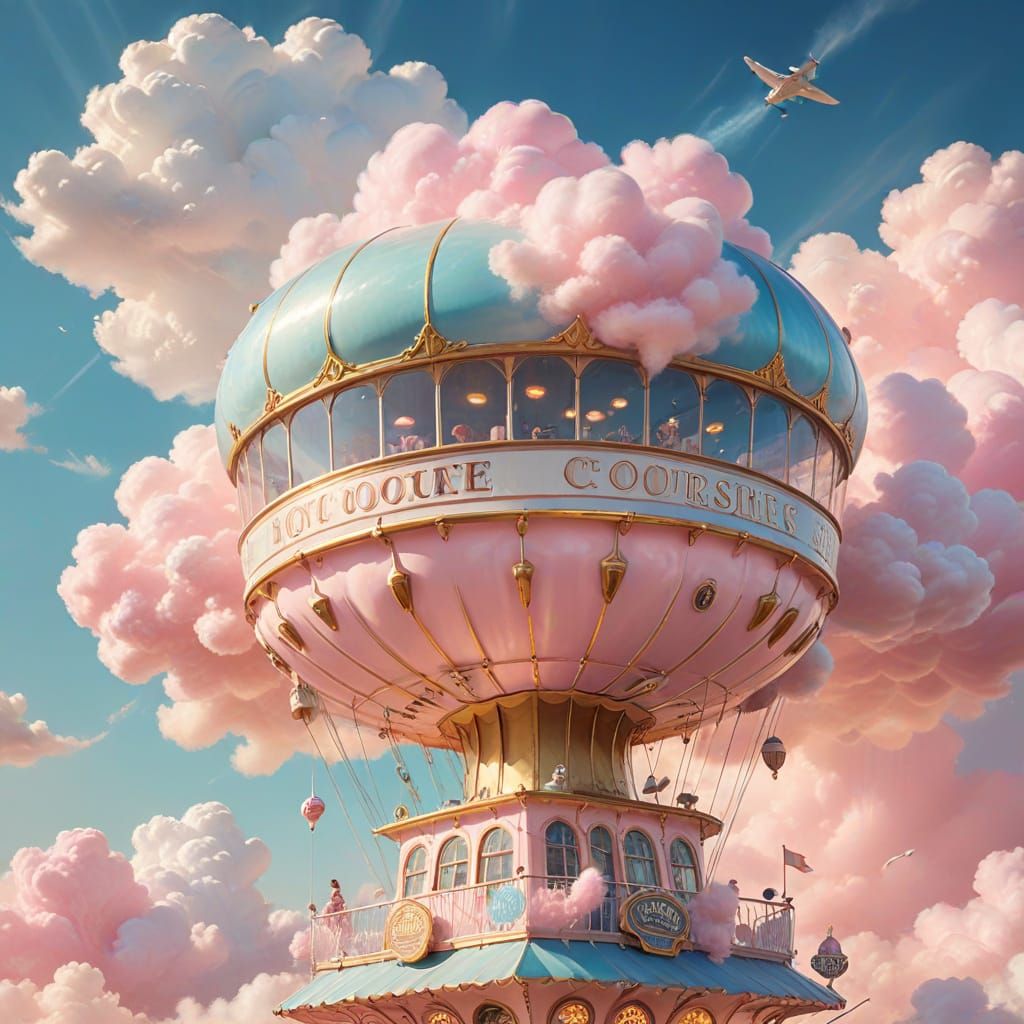 This image shows a whimsical cotton candy shop floating on an airship. It has a retro fantasy art style, warm golden lighting, and heavenly pastel colors. The overall effect is dreamy and ethereal.