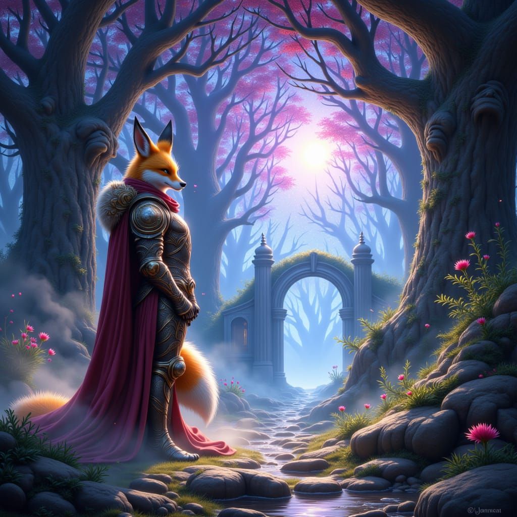 This digital painting depicts a fox knight in ornate armor guarding a dream realm portal. Ethereal mist and magical lighting create an epic, cinematic atmosphere.