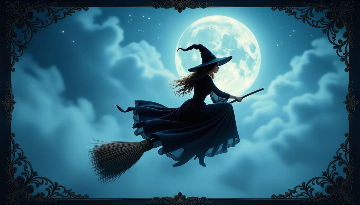 This image shows a witch in a black dress and hat, riding her broomstick across a moonlit sky filled with mist. The fantasy illustration style incorporates realistic photography elements.