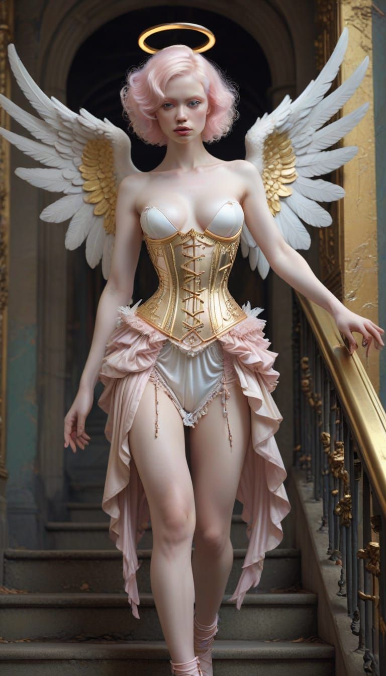 A surreal image shows a pathway to Eden with staircases. The androgynous albino angel is depicted in airbrush makeup with a gold and pink corset, gesturing to come along, in a Dadaism style.