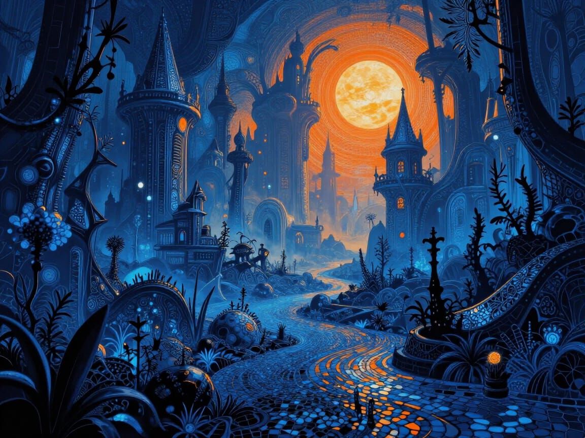 This image depicts a surreal landscape in a blue and orange palette, featuring intricate mosaic details, solarpunk architecture, and bioluminescent flora, creating an otherworldly ambiance with high contrast and cinematic lighting.