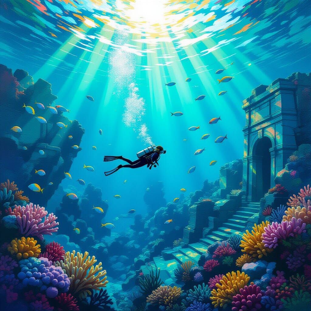 A vibrant diver explores a surreal underwater world filled with coral reefs and ancient ruins. Iridescent fish swim among dappled sunlight in an impressionistic style.