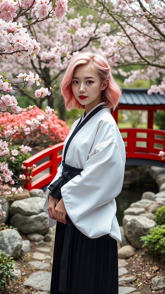 This image shows a young Japanese woman with pastel pink hair posing in a vibrant garden. The garden features cherry blossoms, stone lanterns and a red bridge, rendered with hyperrealism.