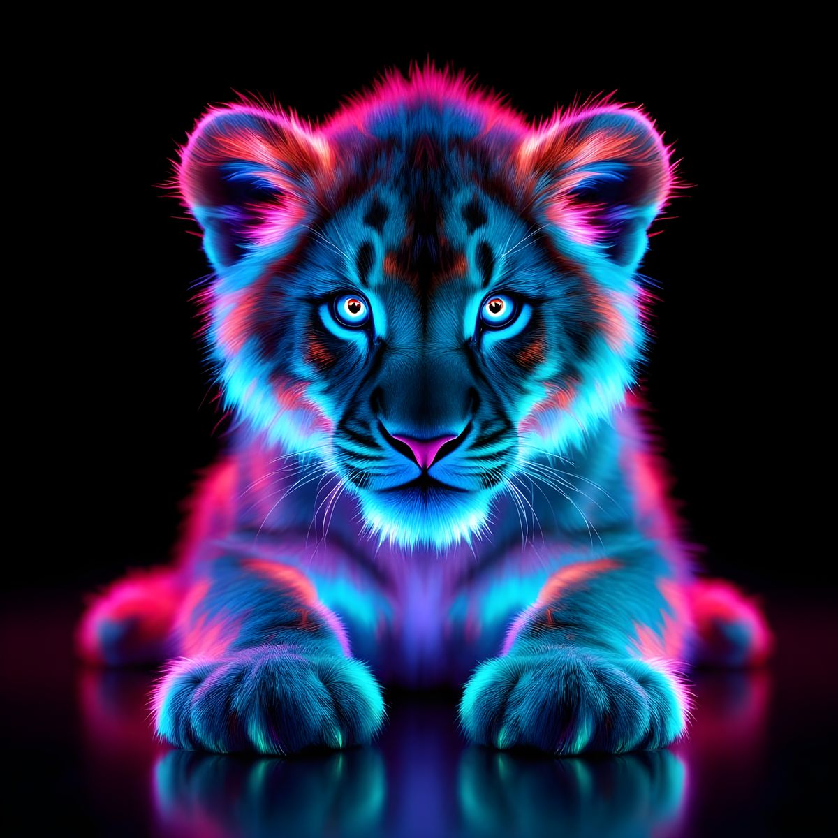 This image shows a neon baby lion glowing against a black backdrop. The digital artwork features vibrant bioluminescent lighting, electric pink and cyan hues, sharply defined fur, and a subtle neon dripping effect.