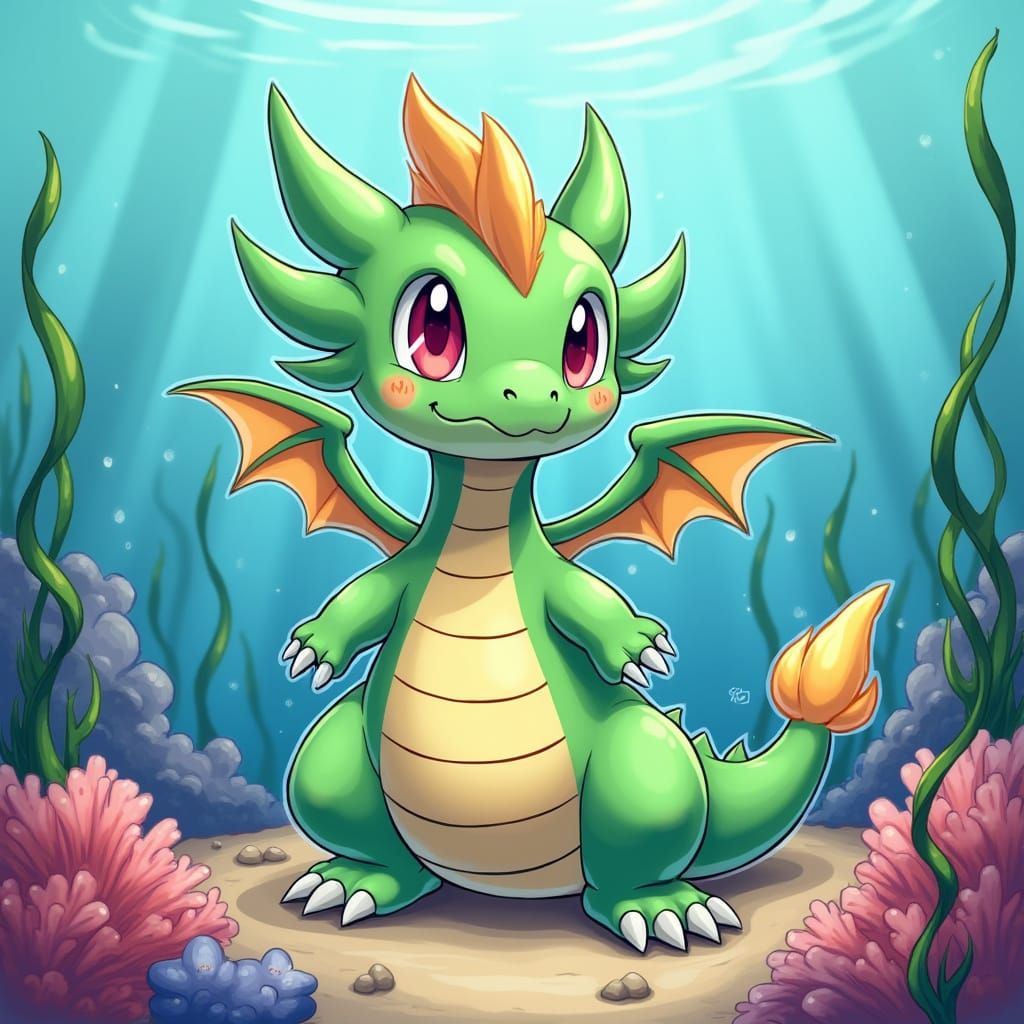 This image shows a cartoon dragon-like water Pokémon in a lively ocean. The style features bold lines, bright colors, and exaggerated features, creating a cute and engaging scene.