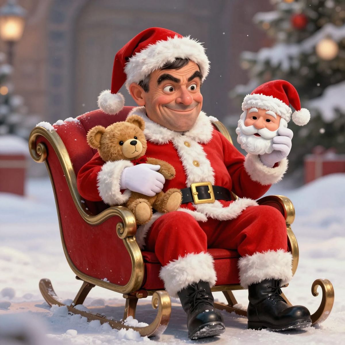 A humorous, cinematic caricature of Mr. Bean in a Santa suit, joyfully holding his teddy bear in a sleigh. Features exaggerated features, warm lighting, and saturated colors for a comedic effect.