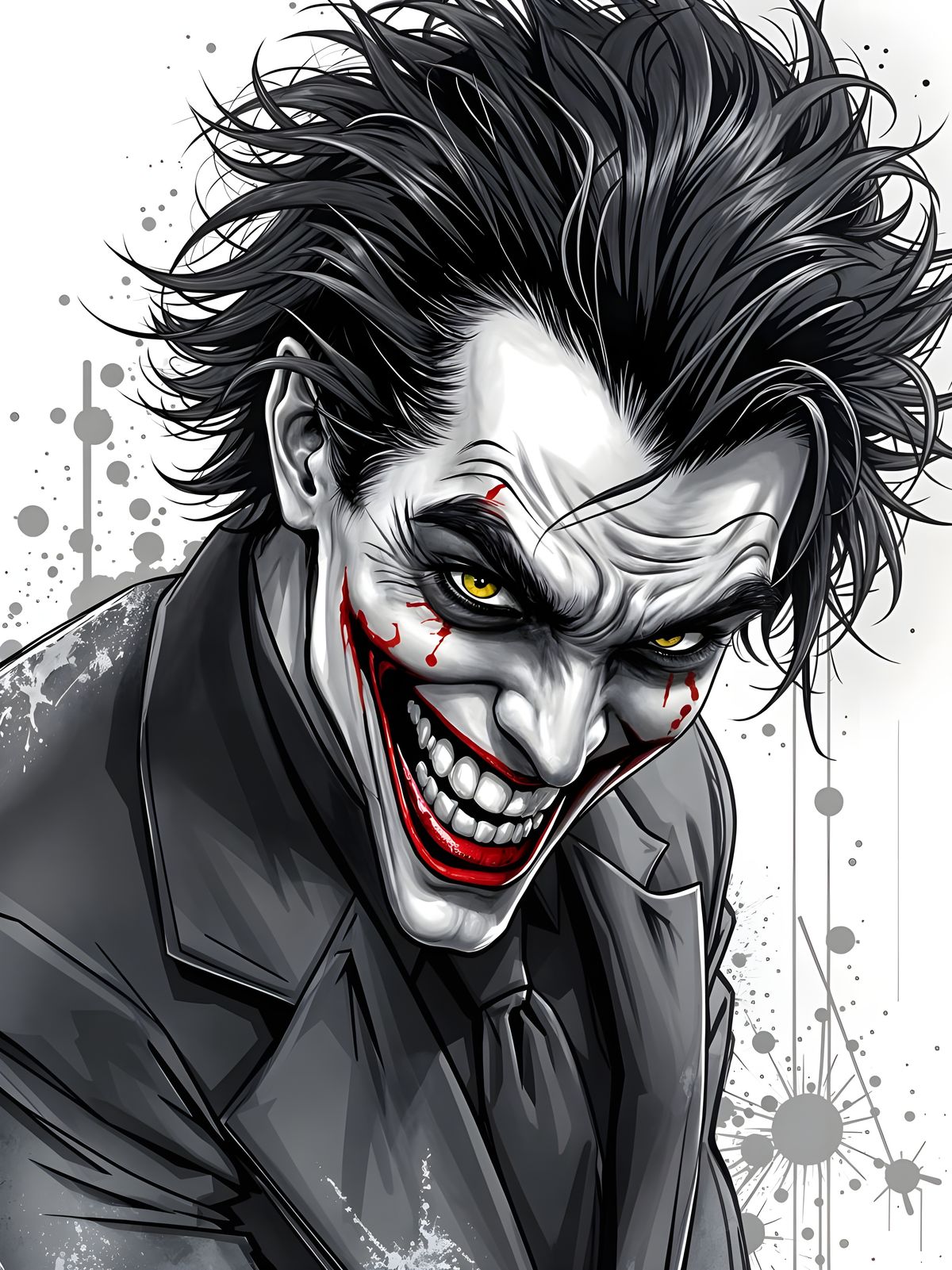 A striking picture of the Joker in a grayscale comic book style. The image highlights the character's menacing grin, intense yellow eyes, and blood-red facial marks, set against an ink-splattered background.