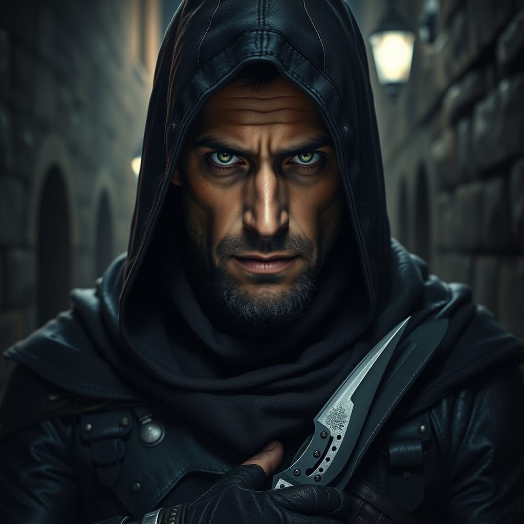 This image shows a mysterious figure in a dark alley, with piercing eyes and rugged features, hinting at years of experience and a deadly profession, clad in a tactical outfit with hidden blades.