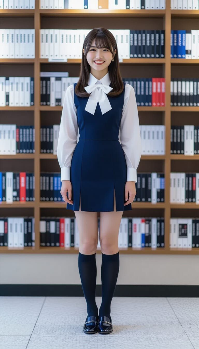 This image shows a young woman in a navy formal Japanese jumper dress uniform and a white cropped blouse. She wears knee-high socks and high heels, smiling shyly.