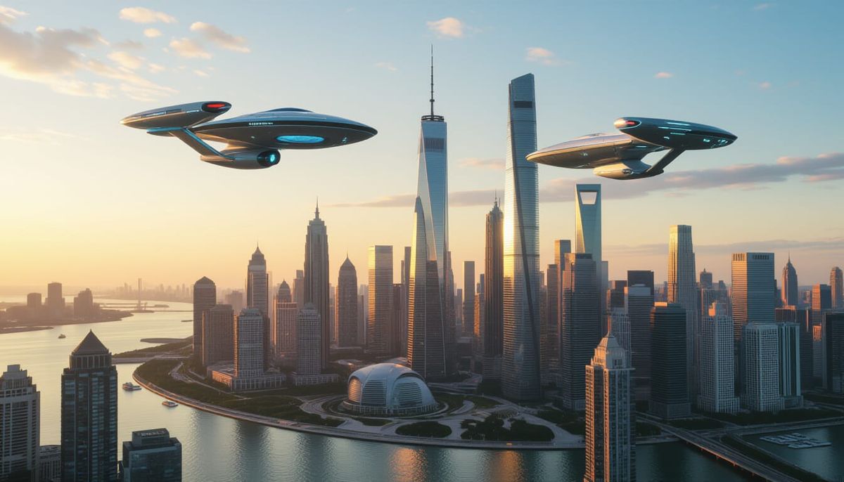 This image showcases a stunning, photorealistic cityscape bathed in daylight. Towering skyscrapers define the modern, futuristic architecture, complemented by luxurious flying vessels reminiscent of Starfleet.