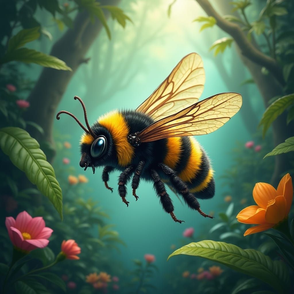 A fantastical illustration of a half-bumble bee, half-raccoon hybrid soaring through the emerald-green rainforest canopy, surrounded by exotic flowers and lush foliage, in a dreamlike style with intricate textures and soft lighting.