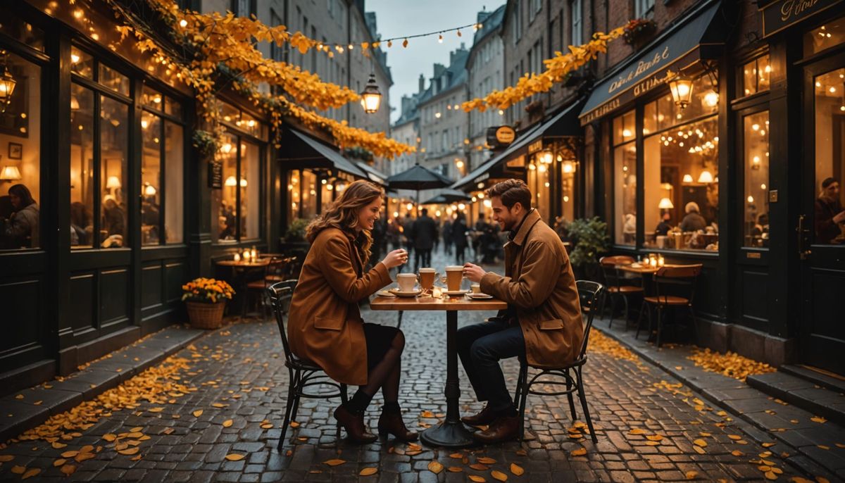 This image shows a couple enjoying a romantic autumn evening at an outdoor cafe. Soft candlelight and string lights illuminate the cobblestone street as they share coffee.