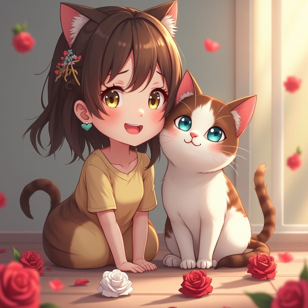 A hyperrealistic 3D anime illustration of a cafe tabby cat and a woman with brown hair. They are surrounded by red and white roses, with the woman wearing turquoise heart earrings.