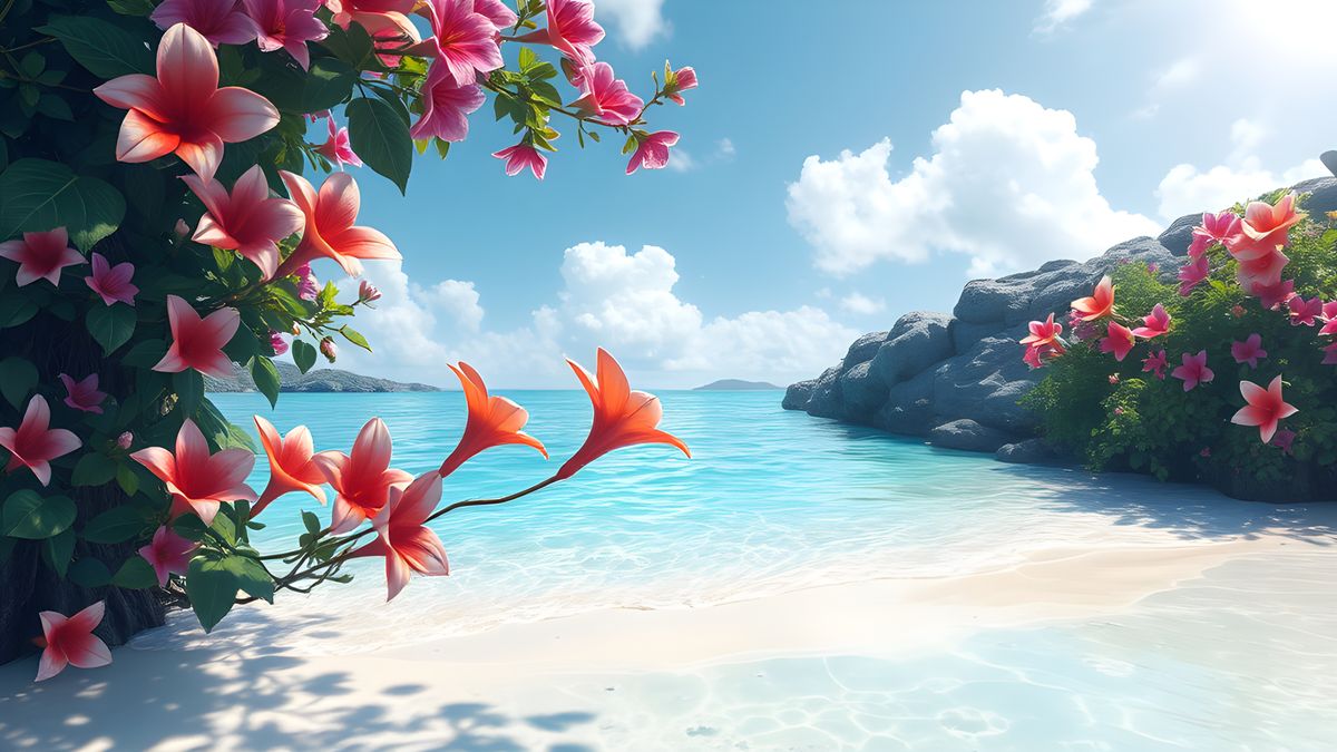 A vibrant cove with crystal-clear water and a sandy shore, bursting with colorful flowers. This 3D anime art showcases extreme detail and breathtaking beauty.