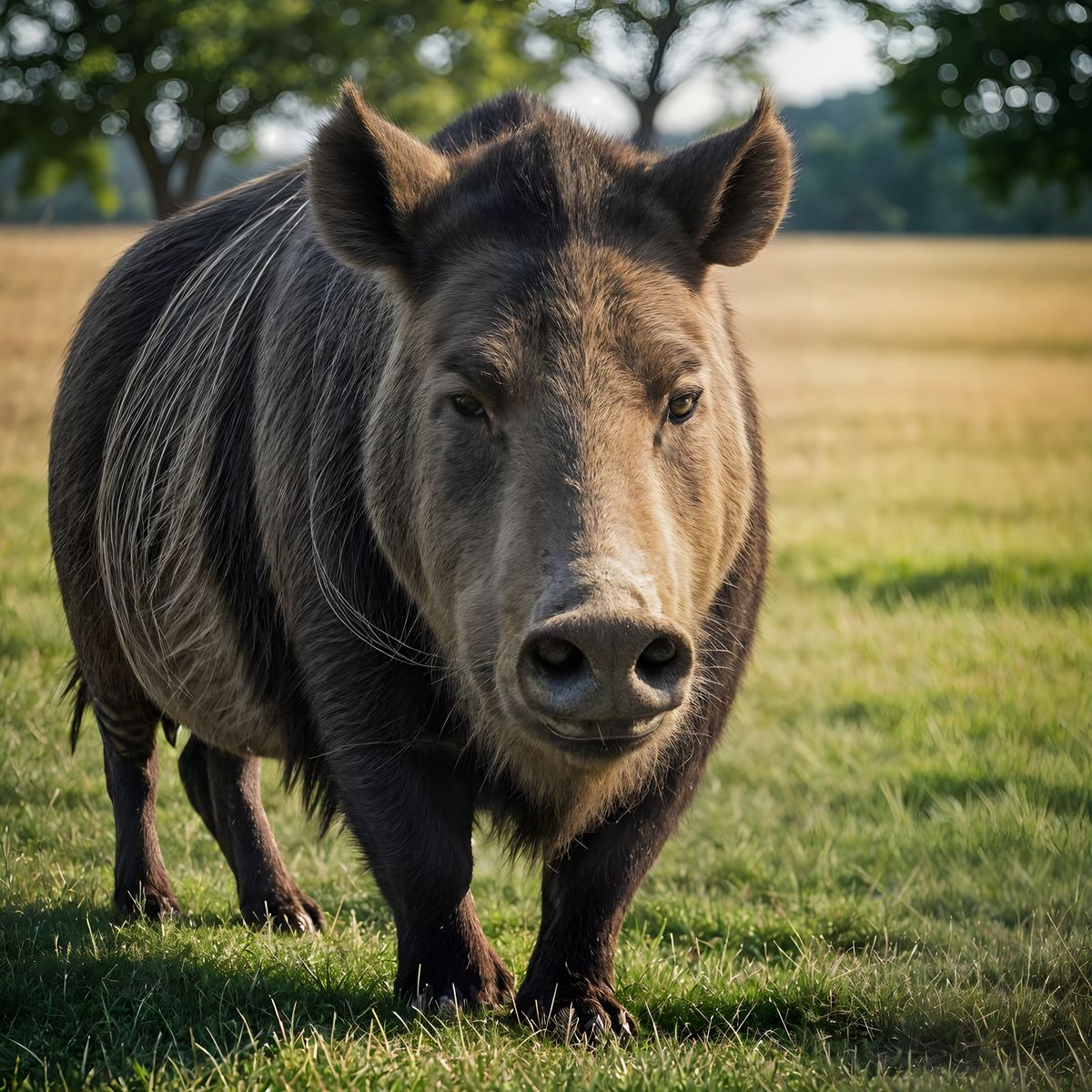 A photograph of a large, powerful wild boar in a serene natural setting, captured with professional-grade equipment and expert lighting techniques.