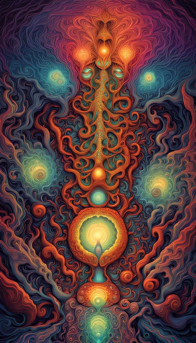 This image showcases a vivid, hyperdetailed depiction of diverse eldritch creatures emerging from a cave, rendered with a surreal, psychedelic aesthetic.