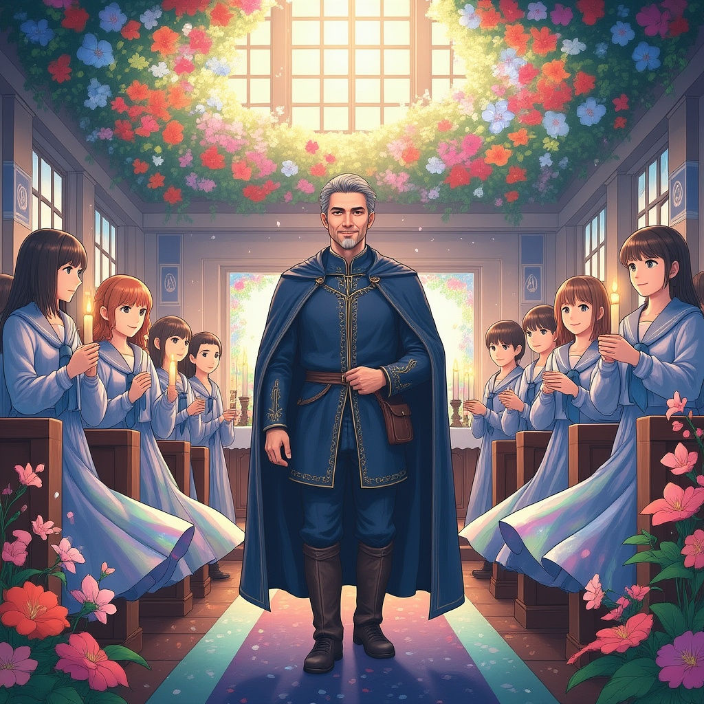 A magical wedding scene at a school adorned with exotic flowers. Students in shimmering robes hold candles, illuminating the path to the altar where the radiant bride awaits, in a silky white gown.