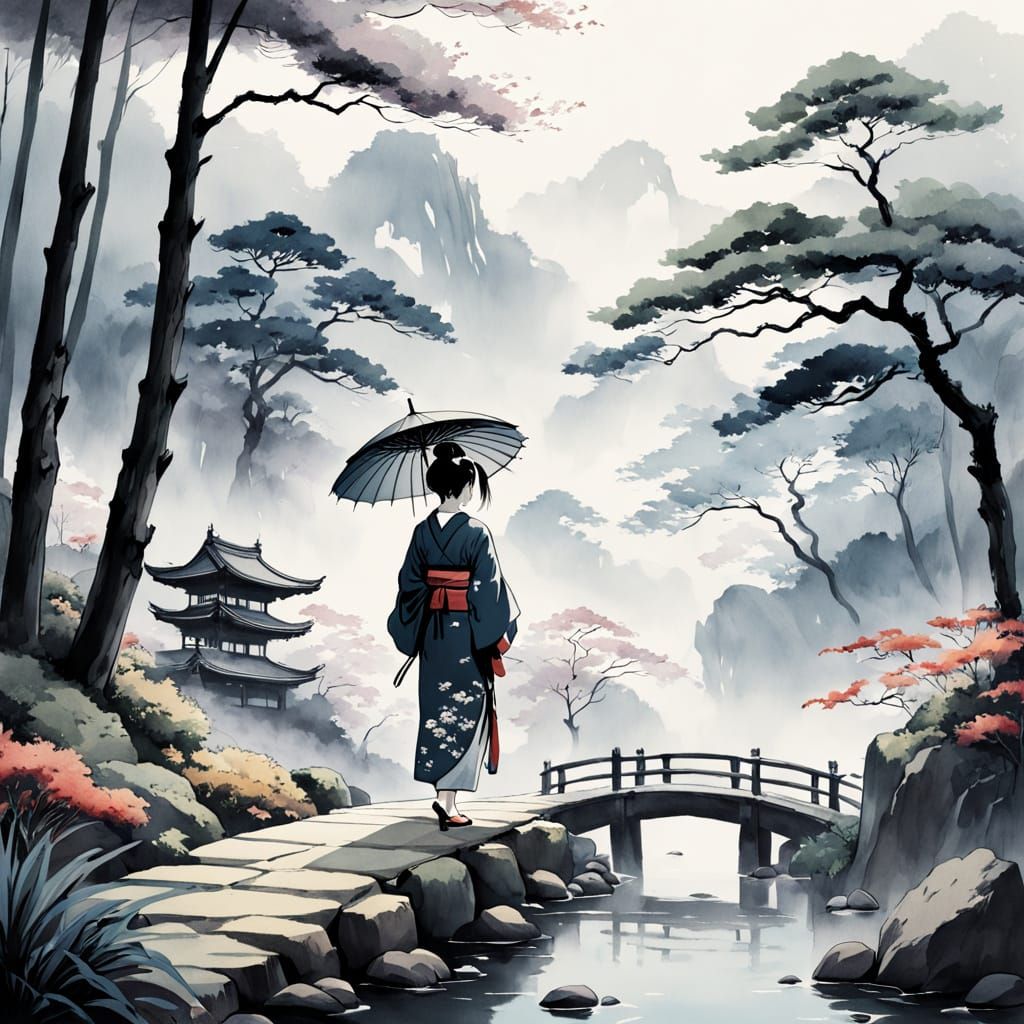 Easily create your own sumi-e paintings of Japanese women in misty gardens with our free AI image generator