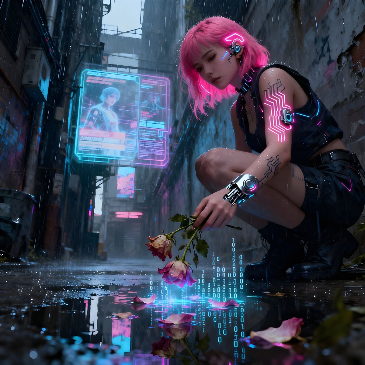A cinematic, highly detailed illustration of a woman with neon hair and cybernetic implants in a moody, rainy alley. Features glowing tattoos and holographic ads.