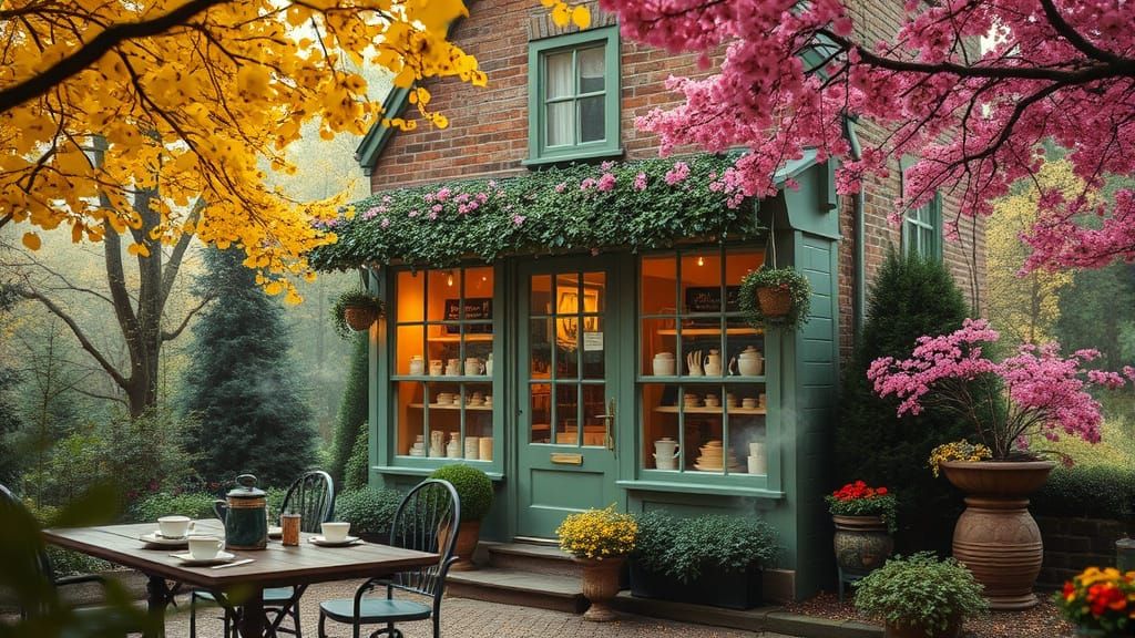 A charming image of an English tea shop nestled in a whimsical forest. The scene features warm lighting, soft bokeh, and earthy tones, reminiscent of a nostalgic storybook illustration.