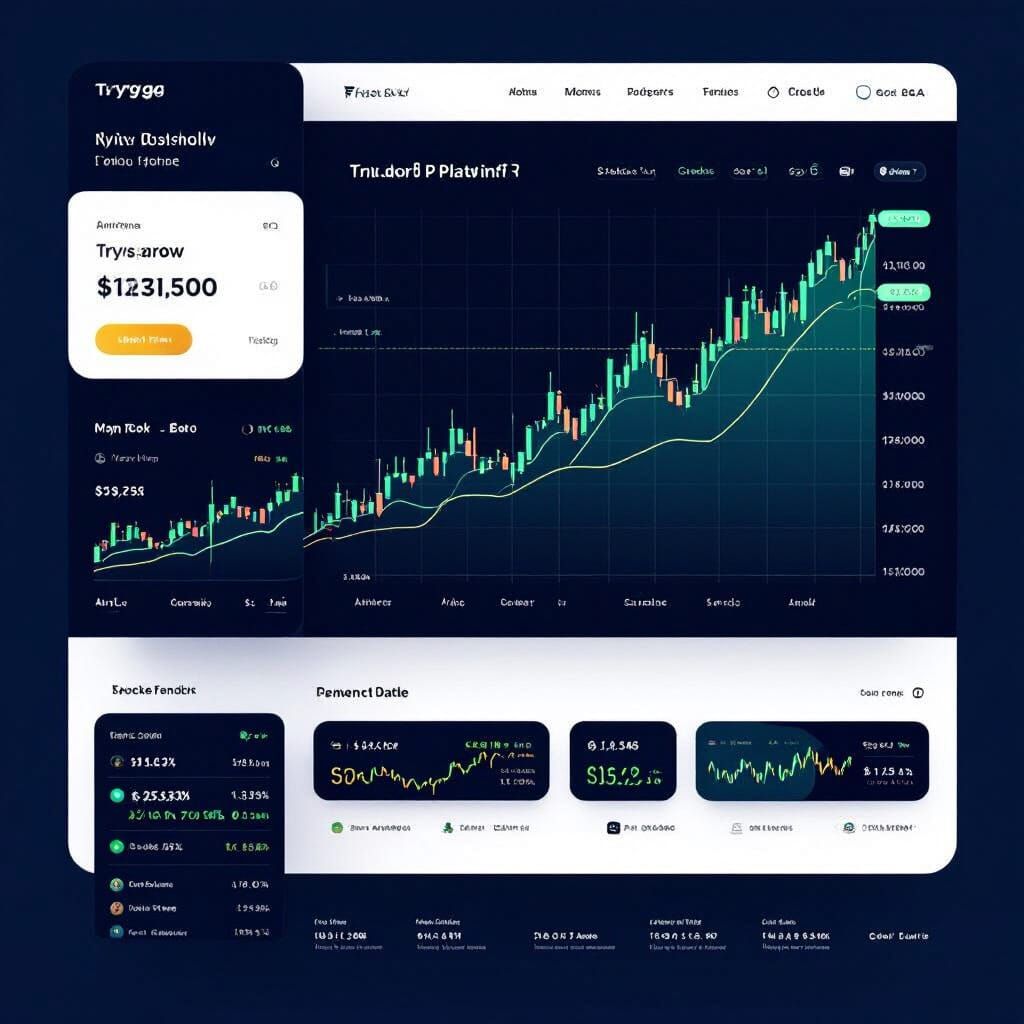 This image shows a sleek, modern digital interface for the Trygg Bitrow Trading Platform. It features a minimalist design with deep blues, vibrant greens, and gold accents, displaying financial data and graphs for a sophisticated feel.