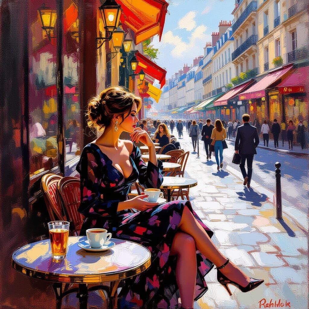 A vivid image of a woman enjoying coffee on a busy Parisian sidewalk. The artwork blends impasto brushstrokes with hyperreal color grading, creating a dynamic and glamorous scene.