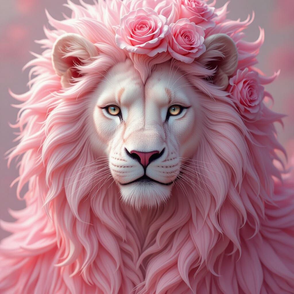 A striking picture of a pink lioness with a lush mane and piercing gaze. The image blends realism with fantasy elements, showcasing vibrant textures and colors in a feminine and powerful aesthetic.