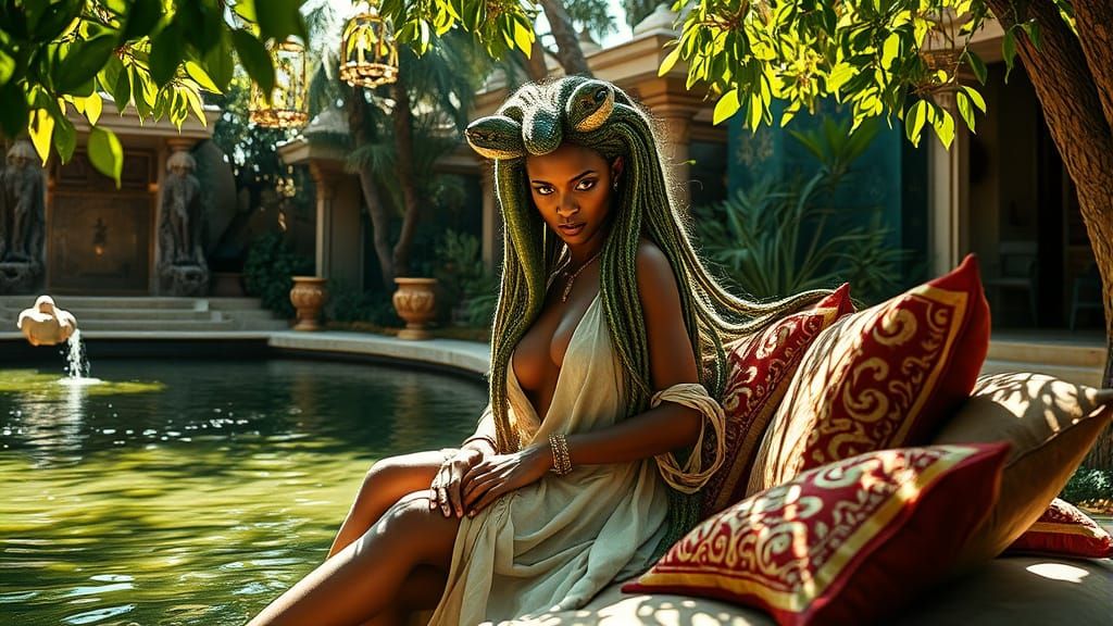 This image shows a snake-haired queen lounging by a pond in an Egyptian-style garden. A servant brings her a drink in the sunlit scene, captured with dramatic lighting and extreme detail.