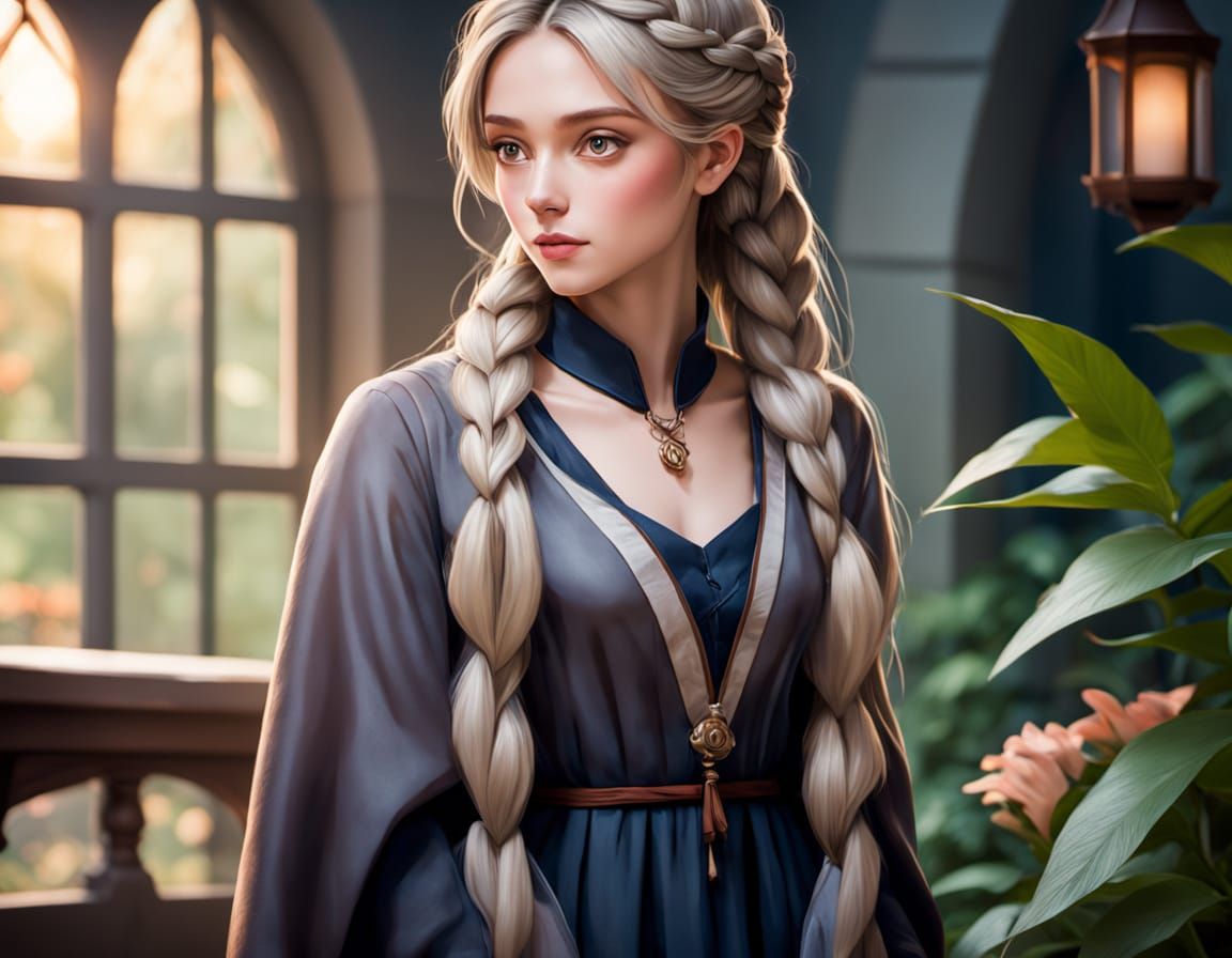 This image is a serene portrait of a woman with braided hair and a brown dress, set against a lush garden backdrop with soft, natural lighting and a warm color palette reminiscent of impressionist art.