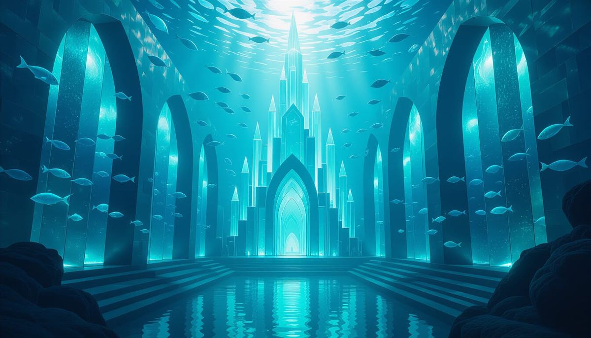 This image showcases a majestic underwater city built from smooth sea glass in blue and green hues. Bioluminescent fish navigate through frosted glass archways in a glowing, fantasy art style.