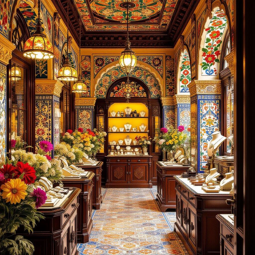 A view of a vintage jewelry store in Andalusia. The scene is full of flowers, ornate decorations, and intricate tiles, rendered with warm golden lighting in an art nouveau style.