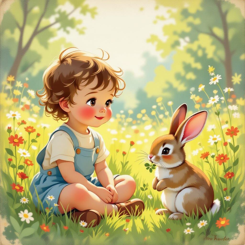 This image depicts a vintage-style illustration of a child sitting in a sun-dappled meadow with wildflowers. A rabbit is nearby, evoking childhood innocence and natural beauty in a nostalgic aesthetic.