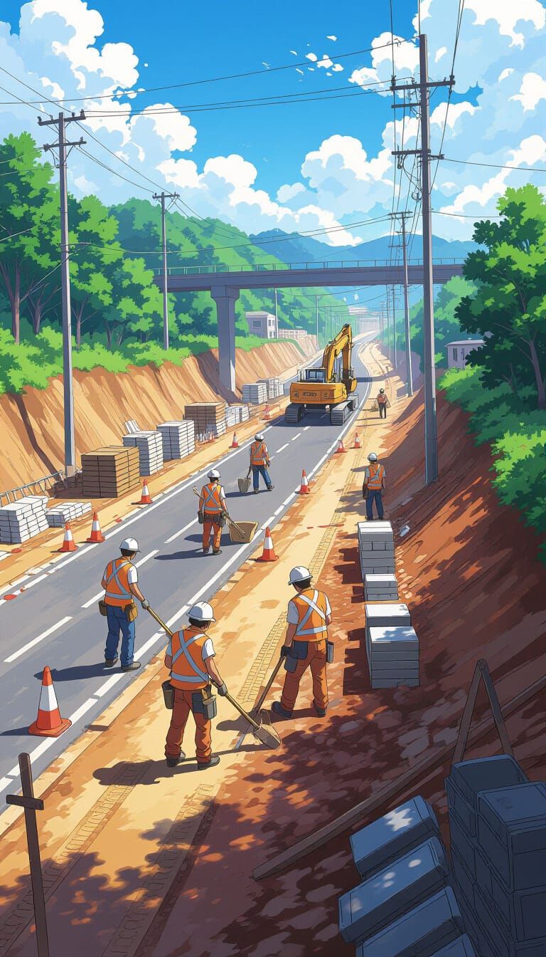 This image shows road construction workers in a dynamic anime key visual style. It features bright, saturated colors and dramatic lighting, capturing the energy of their work.