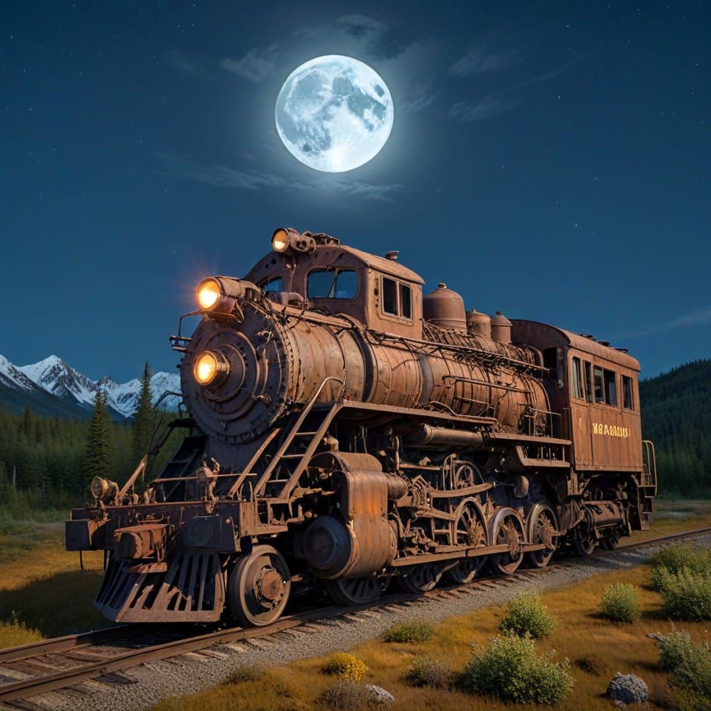 This image depicts an abandoned, decrepit vintage train engine set against a vast Alaskan wilderness backdrop illuminated by a bright full moon.