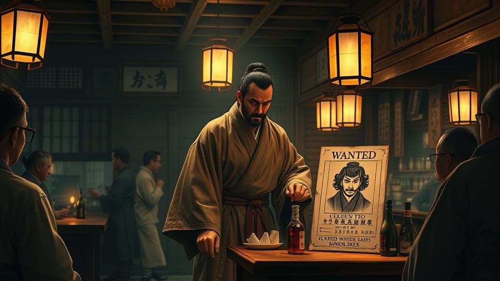 This image shows a lone ronin entering a dimly lit Japanese tavern. The wanted poster on the table displays his likeness in a cinematic, dramatic style. The scene is reminiscent of classical Japanese art.