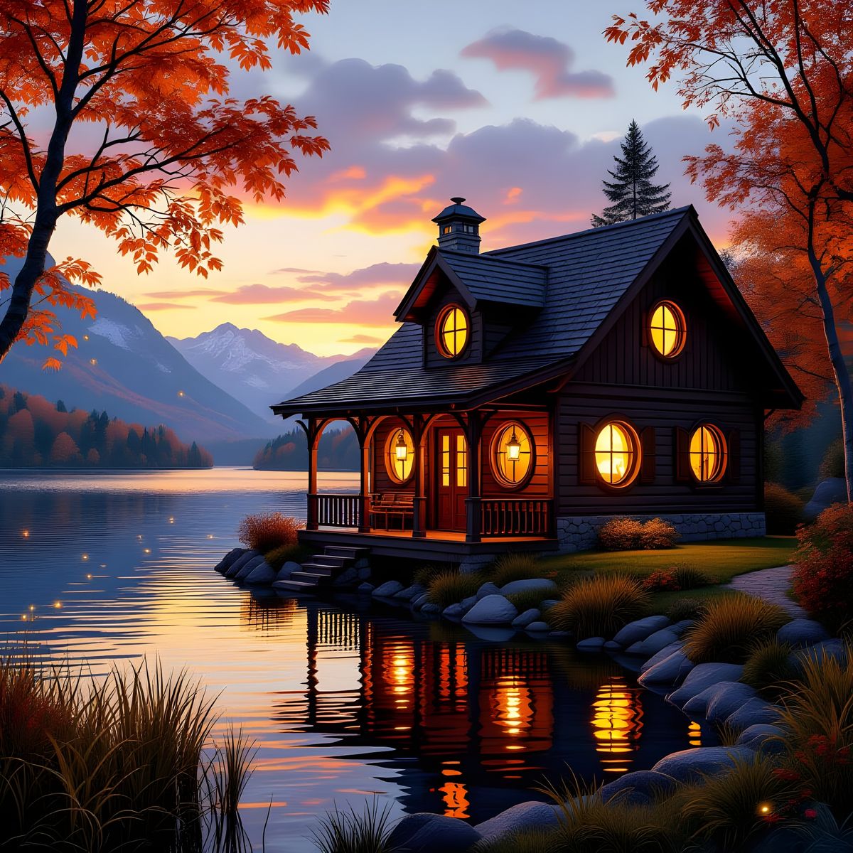 A picturesque lakeside cottage glows warmly at sunset, its reflection shimmering in the tranquil water. The cozy scene is framed by colorful autumn trees and distant mountains, rendered in vivid detail with painterly textures.