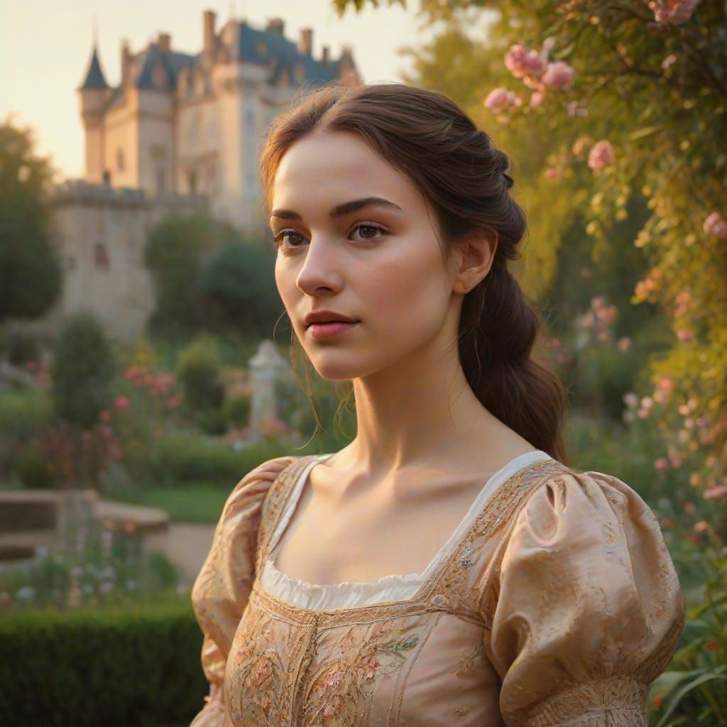 A beautiful oil painting of a young woman in a garden with a castle. The artwork features pastel colors, golden embroidery, soft focus and warm lighting to create a fairytale-like ambiance.
