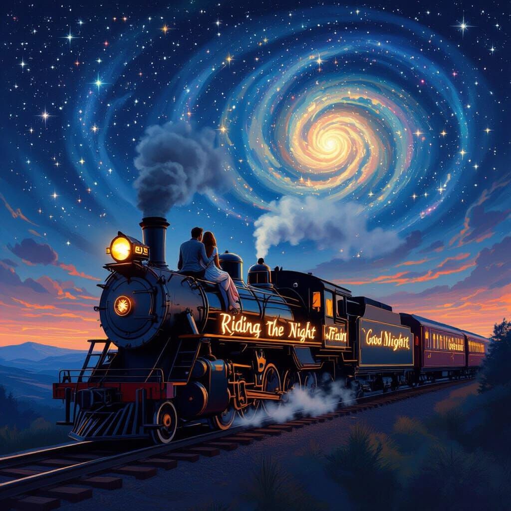 A captivating image showing two lovers on a vintage steam train speeding into a starlit night. The scene evokes luminous romanticism blended with sci-fi elements. The train has neon lettering.