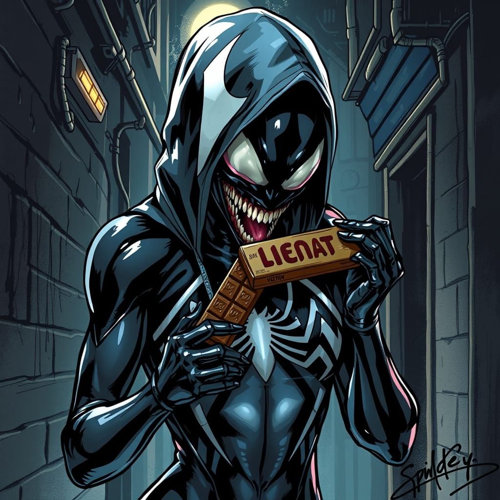 A comic book style image of Spider Gwen in a Venom symbiote suit eating a chocolate bar in an alley. The artwork features dark noir elements and vibrant comic colors.