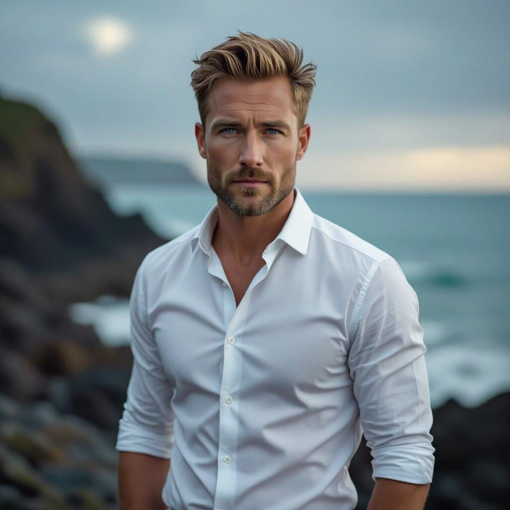 A digital portrait of a handsome man in his thirties standing on a rocky shore. The image features cinematic lighting and emotive depth in a digital art style.